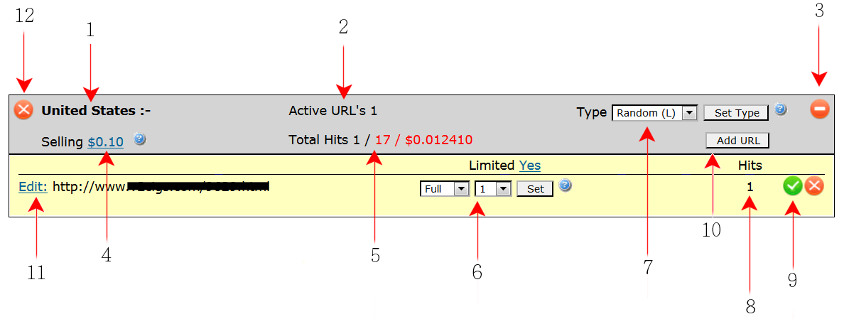 5. The first number in black is the total number of hits/visitors sent to the URL's in this country. The second number in red is the total number of hits/visitors we have sold. The money is the amount we have been paid for the hits, on this occasion we have been paid the equivalent of 73c per 1000 visitors, however this is dependent on the price people are currently bidding for the traffic in this location and can be more or less than the figures shown. It is also worth noting that we actually received 73c cpm even though our selling figure is just 10c